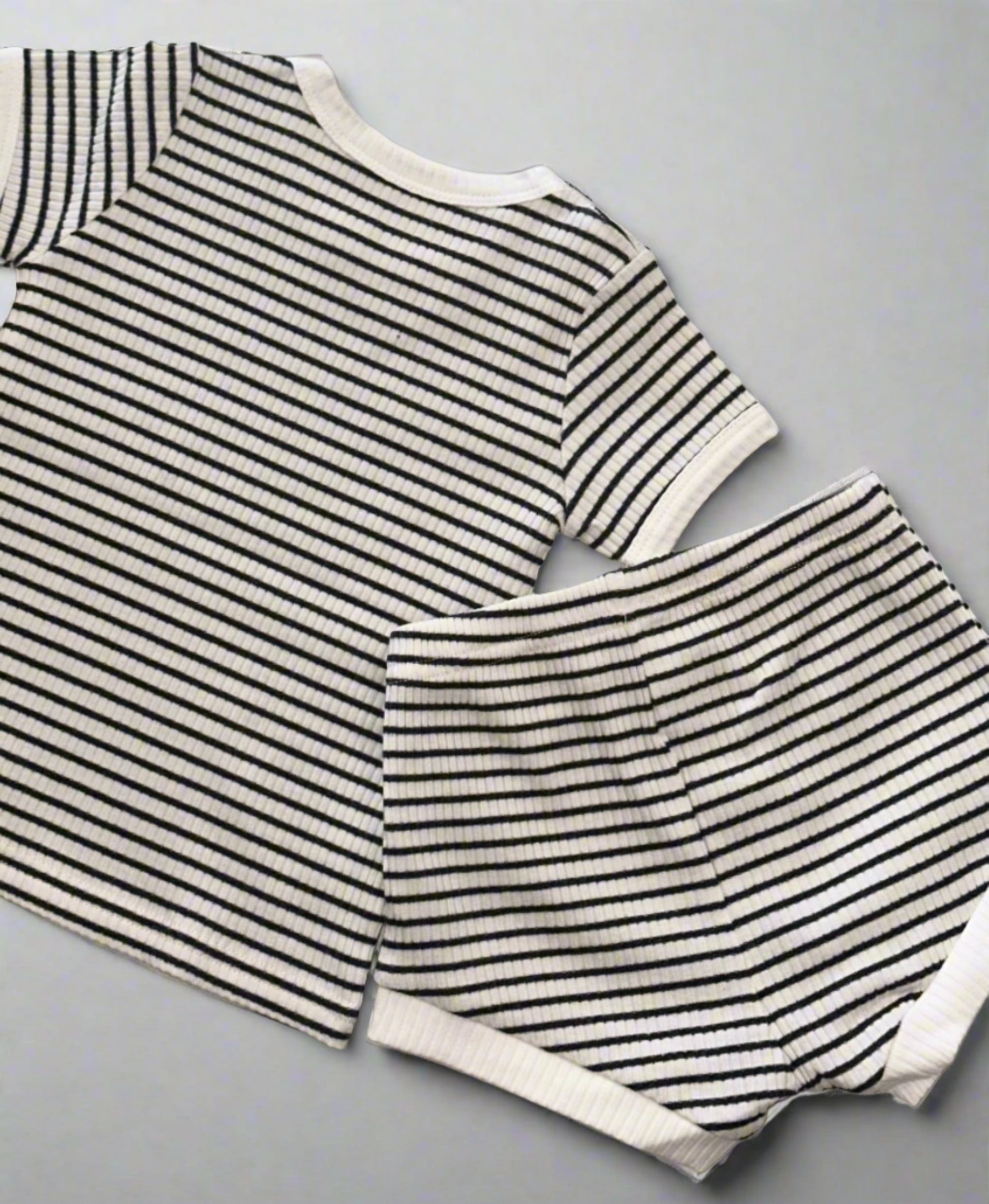 Blijf stijlvol en comfortabel met onze Stripey T-shirt + Shorts Set! Deze baby zwart-witte set biedt de perfecte combinatie van mode en comfort. Met een zachte, ruime pasvorm zijn jij en je kleintje klaar voor wat de dag ook brengt!