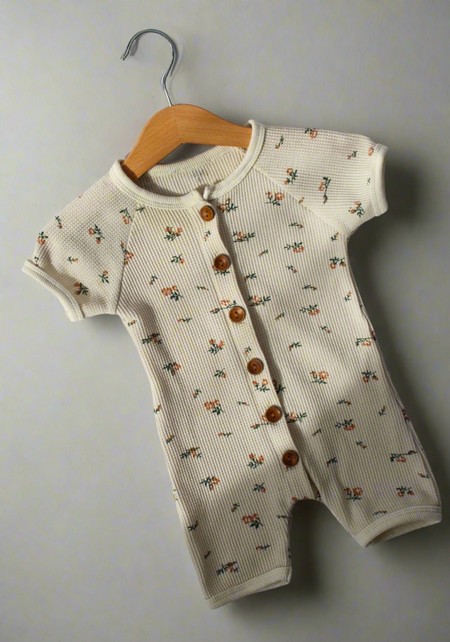 Get ready to bloom in our Floral Romper with dainty short sleeves and vintage vibes. This playful piece features wooden buttons and a fun floral print, perfect for adding some whimsy to your wardrobe. Time to embrace your inner flower child!