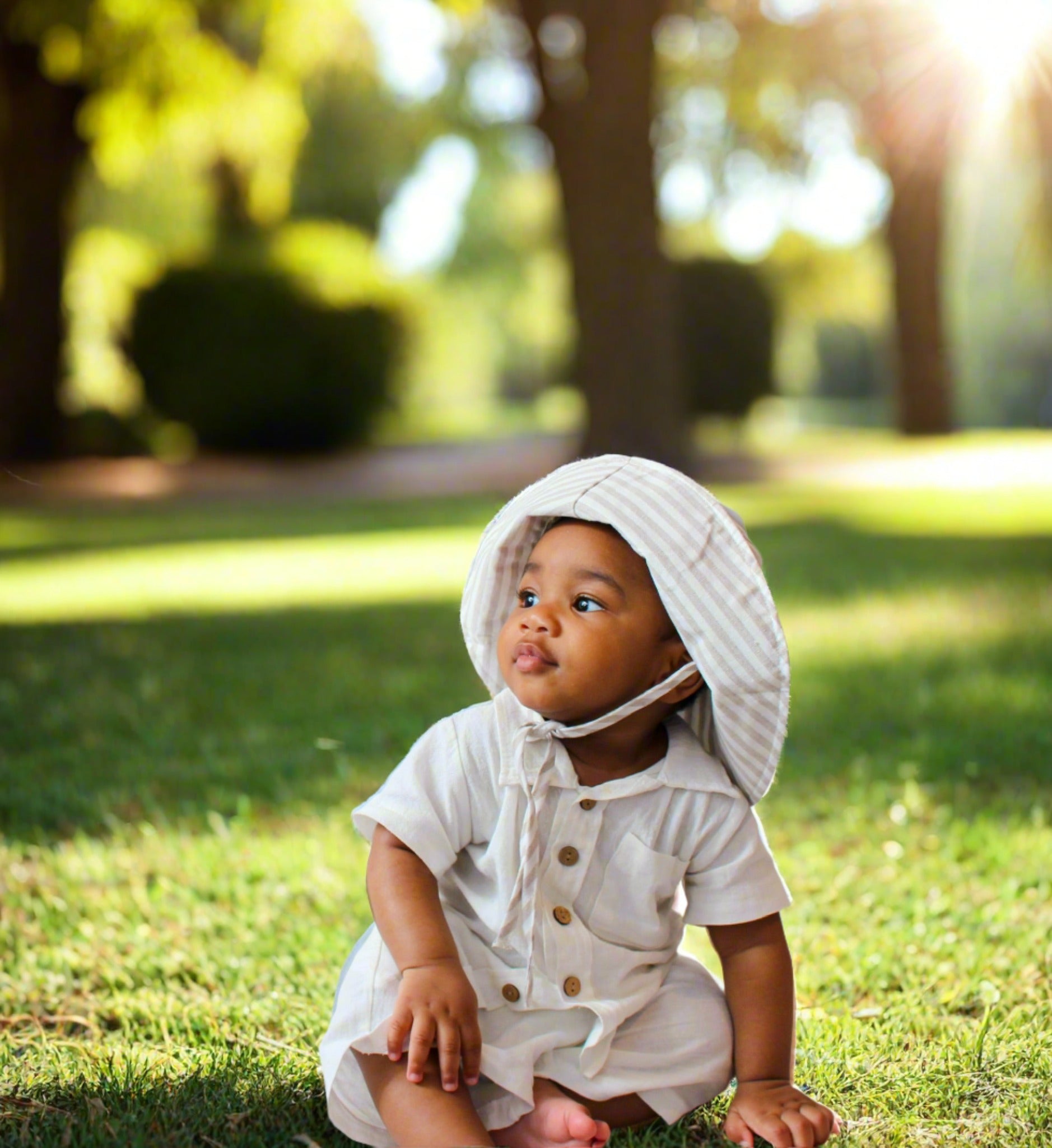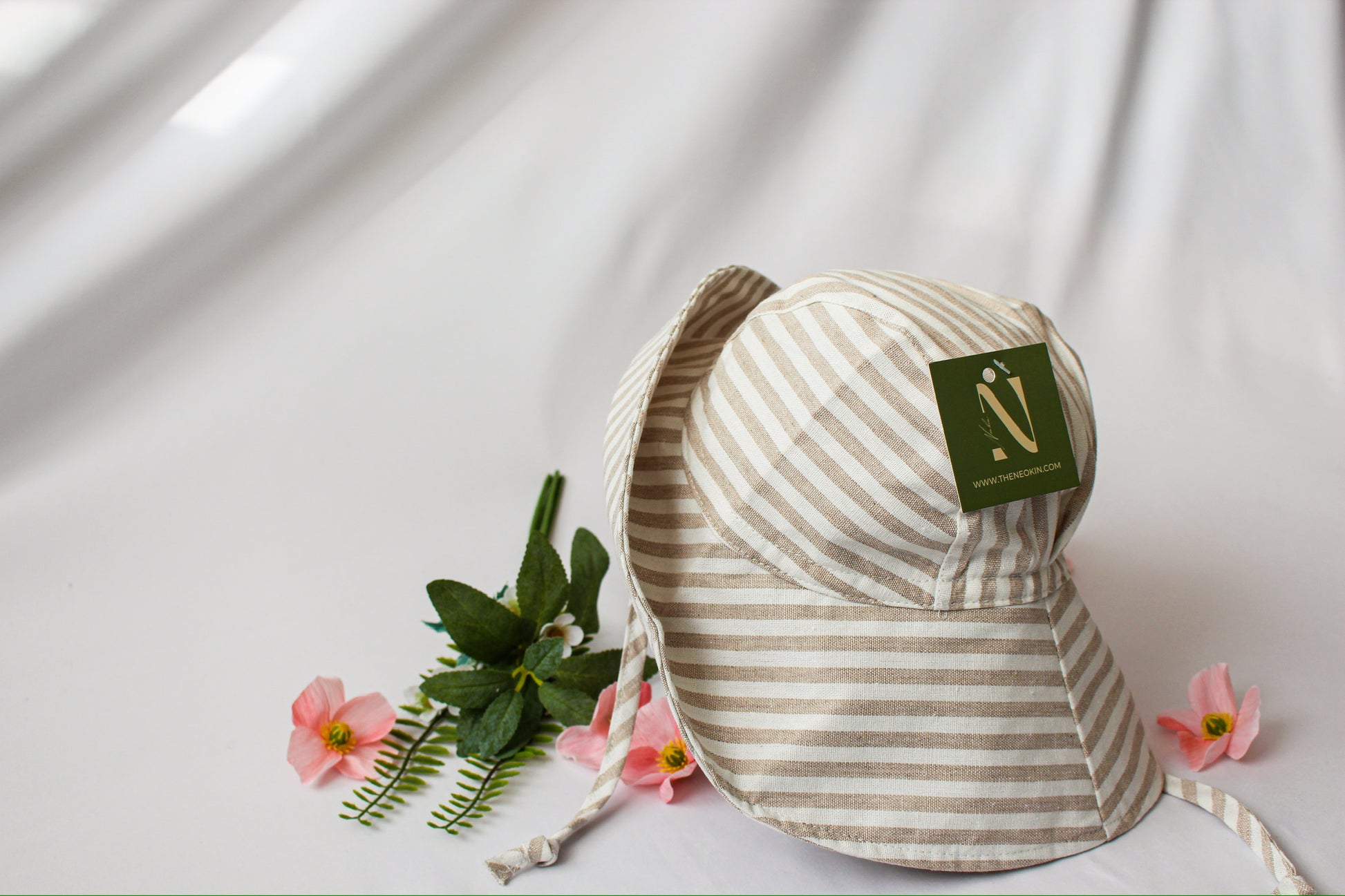 Get ready to protect your head from the sun with The Farmers hat! This wide brim bucket hat not only comes in a stylish striped beige and white design, but also features a strap to keep it securely on your little wriggly one's head. Don't let the sun ruin your day, grab The Farmers hat now!